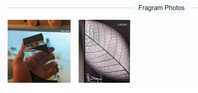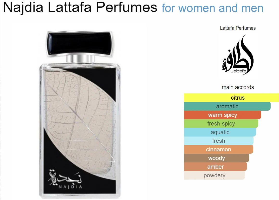Najdia de Lattafa Perfumes est un parfum Aromatique Aquatique pour homme et femme. Ceci est un nouveau parfum. Najdia a été lancé en 2020. Les notes de tête sont Citron, Cannelle, Pomme, Citronnelle et Bergamote; les notes de coeur sont Notes Aquatiques, Lavande, Romarin et Cardamome; les notes de fond sont Ambre, Musc, Cèdre, Bois de santal et Tabac.