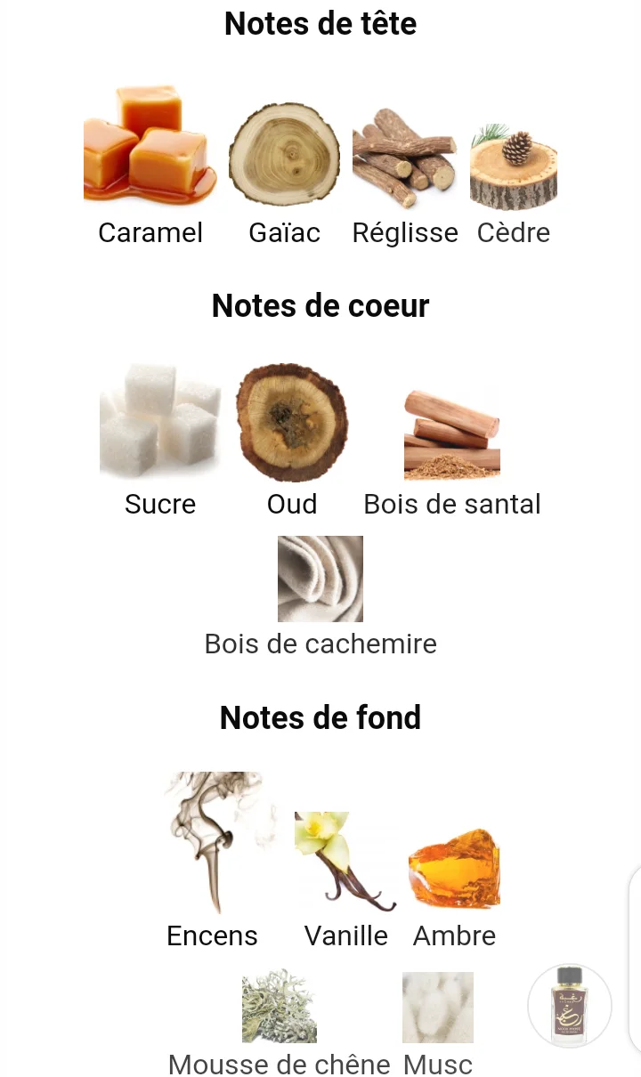 - Notes de cœur : Bois de santal, Bois de cachemire, Oud, Sucre.