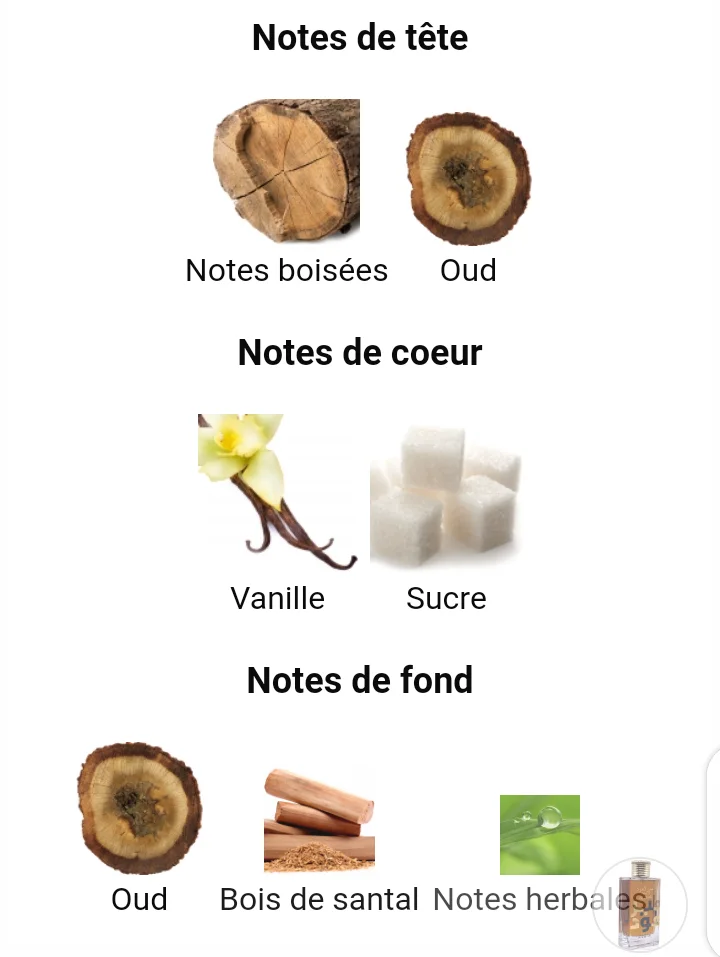 - Notes de fond: Oud, Bois de santal, Notes herbales