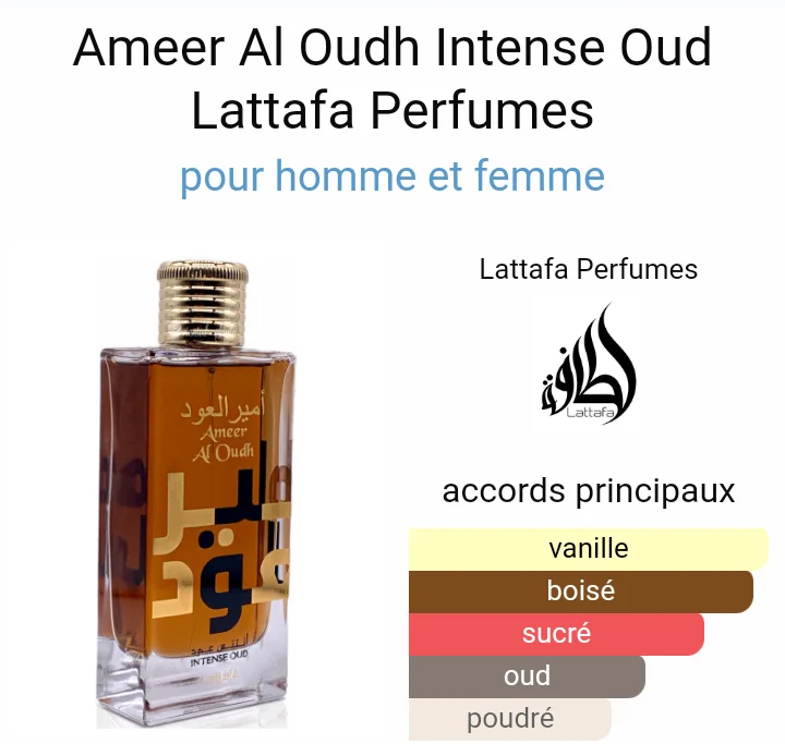 Ameer Al Oudh Intense Oud de Lattafa Perfumes est un parfum Ambré pour homme et femme. Ameer Al Oudh Intense Oud a été lancé en 2021. Les notes de tête sont Notes boisées et Bois d’agar (Oud) ; les notes de coeur sont Sucre et Vanille; les notes de fond sont Bois d’agar (Oud), Bois de santal et Notes herbacées.